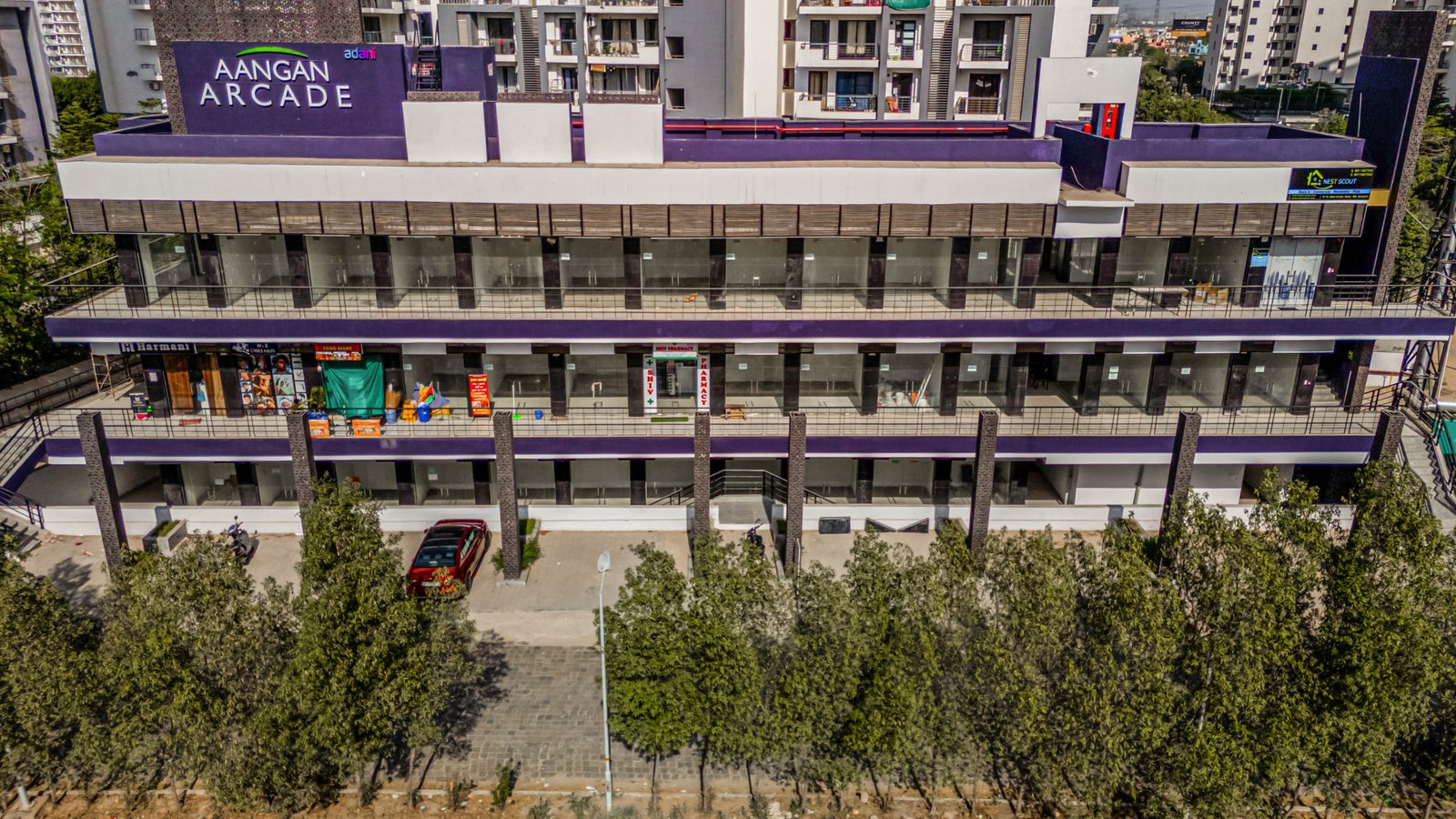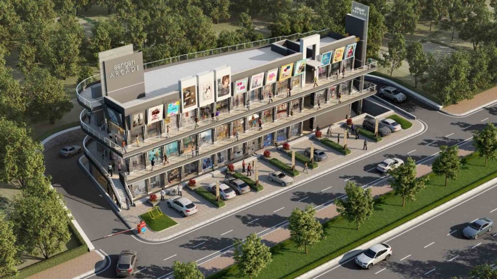 Adani Aangan Arcade retail spaces range from ~68 sq. ft to ~344 sq. ft, suitable for small kiosks to large showrooms.