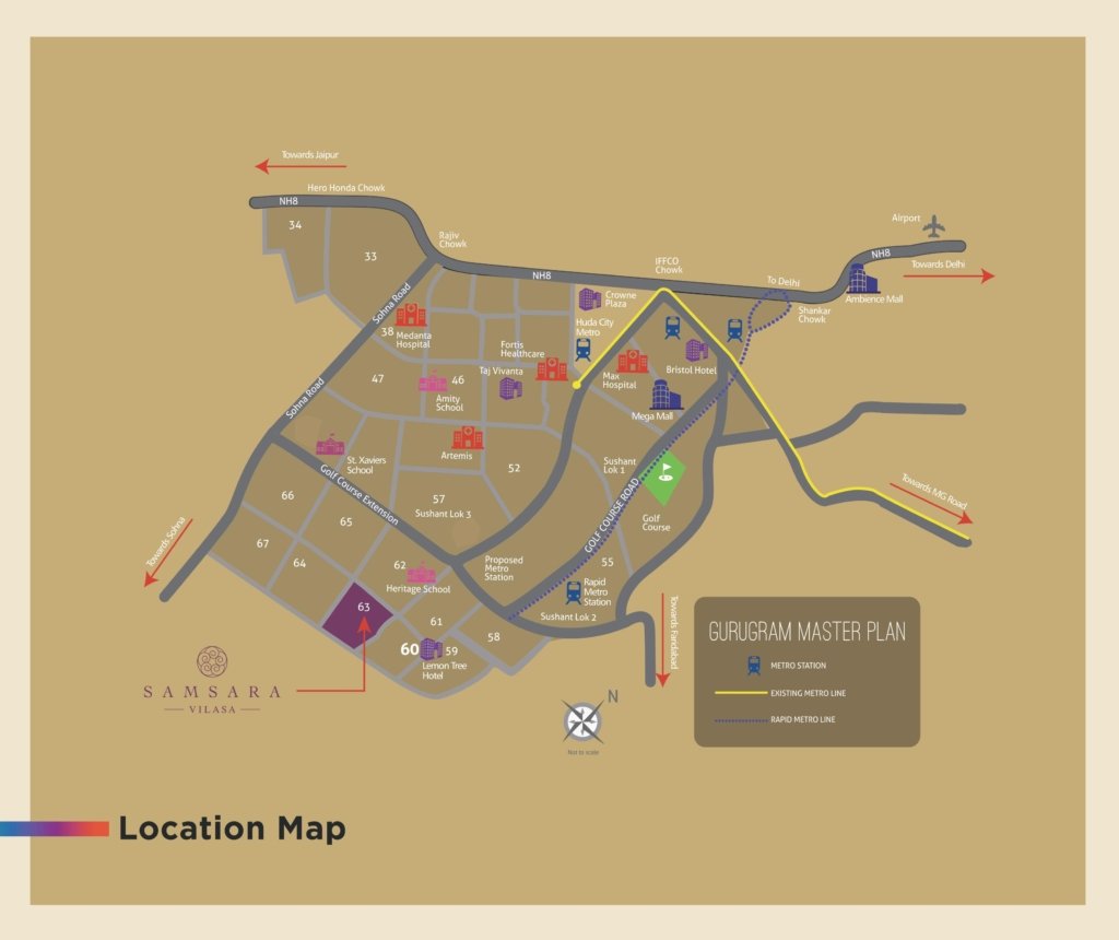 Samsara Vilasa 2.0 Golf Course Road enjoys seamless connectivity to NH-48, Sohna Road, Rapid Metro, and major commercial zones of Gurgaon.