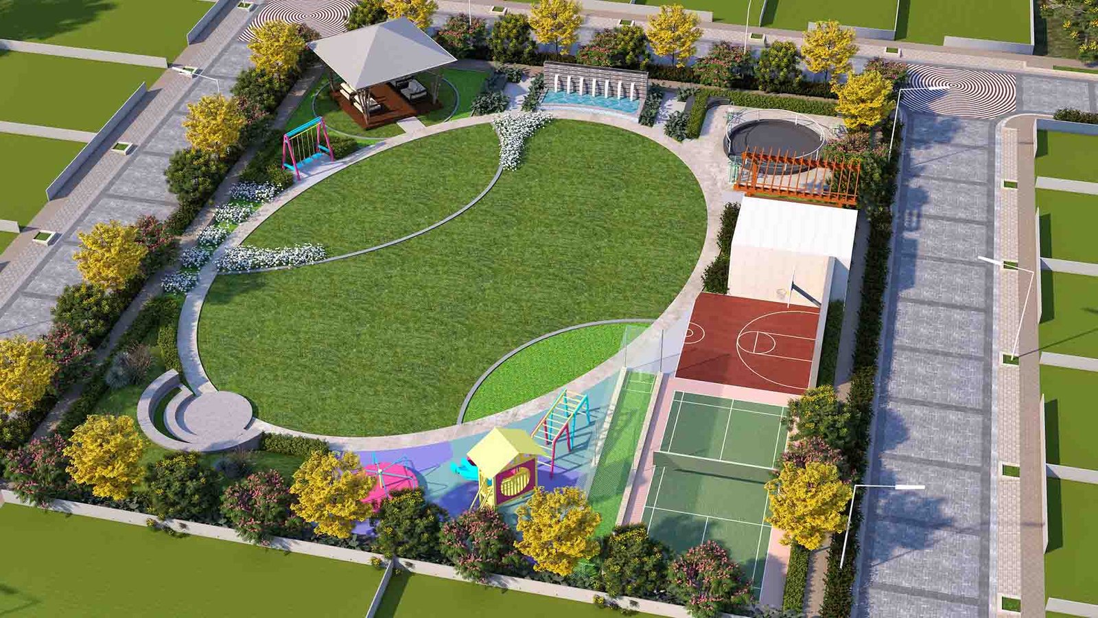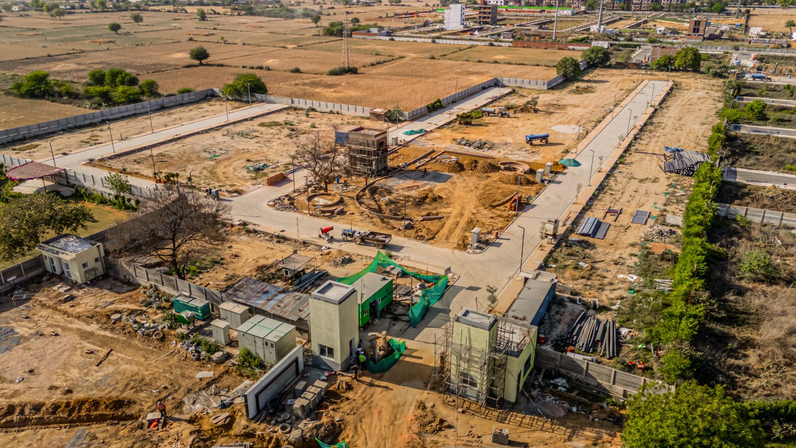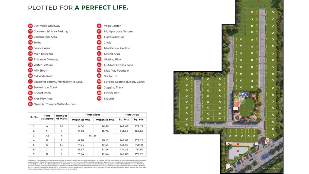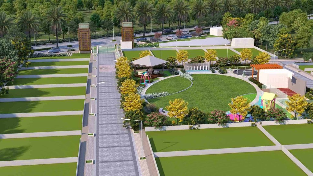 Adani Tatva Estates provides landscaped parks, jogging tracks, children’s play areas, underground utilities, wide internal roads, power backup provisions, and a well-planned green living environment.